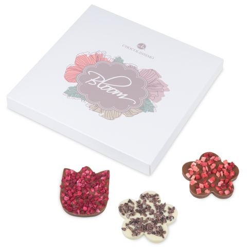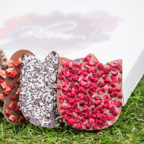 Ingrédients: sucre, beurre de cacao, pâte de cacao, lait entier en poudre, émulsifiant: lécithine de soja; groseilles séchées, lactoserum en poudre, arôme naturel: vanille; Grains de cacao concassées, amandes décortiquées et tranchées, grains de framboises séchées, fraises séchées, noix de coco râpée, antioxydant: E220. Teneur en cacao minimale dans le chocolat noir 56 %, minimum dans le chocolat au lait 33 %, minimum dans le chocolat blanc 28 %. Peut contenir gluten, oeufs, cacahuètes, sésame.