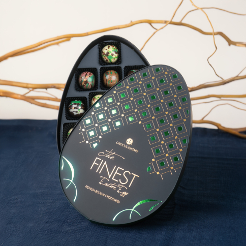 Un coffret de chocolats très élégant en forme d'oeuf de Pâques, joliment décoré de motifs verts-dorés et remplie de 19 petits oeufs en chocolats fourrés belge faits à la main. Un cadeau très original pour Pâques à offrir et à déguster avec vos proches. Ce coffret est composé de :