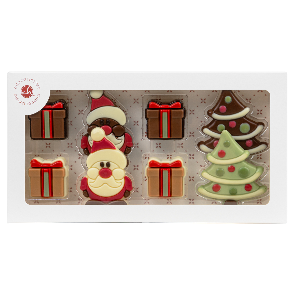 Ingrédients: sucre, beurre de cacao, lait entier en poudre, noisettes, pâte de cacao, lait écrémé en poudre, émulsifiant: lécithine de soja, E476; arôme naturel: vanille, carottes; colorant: E120, E160c; concentré de: spiruline, pommes; huile végétale: tournesol; matières grasses laitières anhydre. Teneur en cacao minimale dans le chocolat noir 54 %, minimum dans le chocolat au lait 28 %, minimum dans le chocolat blanc 22 %. Contient des matières grasses végétales en plus du beurre de cacao. Peut contenir gluten, oeufs, cacahuètes, sésame.