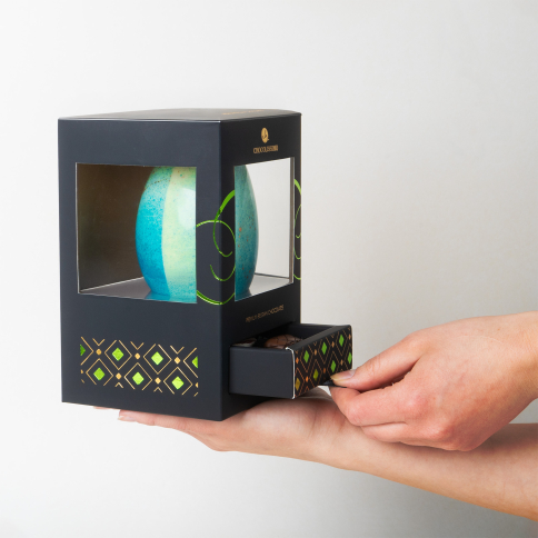 Le coffret comprend quatre pralines artisanales, créées à partir du meilleur chocolat belge par les meilleurs chocolatiers européens. Chacune d’elles renferme un cœur fondant et velouté qui se dissout délicatement en bouche, offrant une expérience gustative incomparable. L’œuf de Pâques en chocolat blanc est présenté dans une élégante boîte premium noire, décorée et dotée d’un tiroir, ce qui rend le cadeau prêt à être offert.